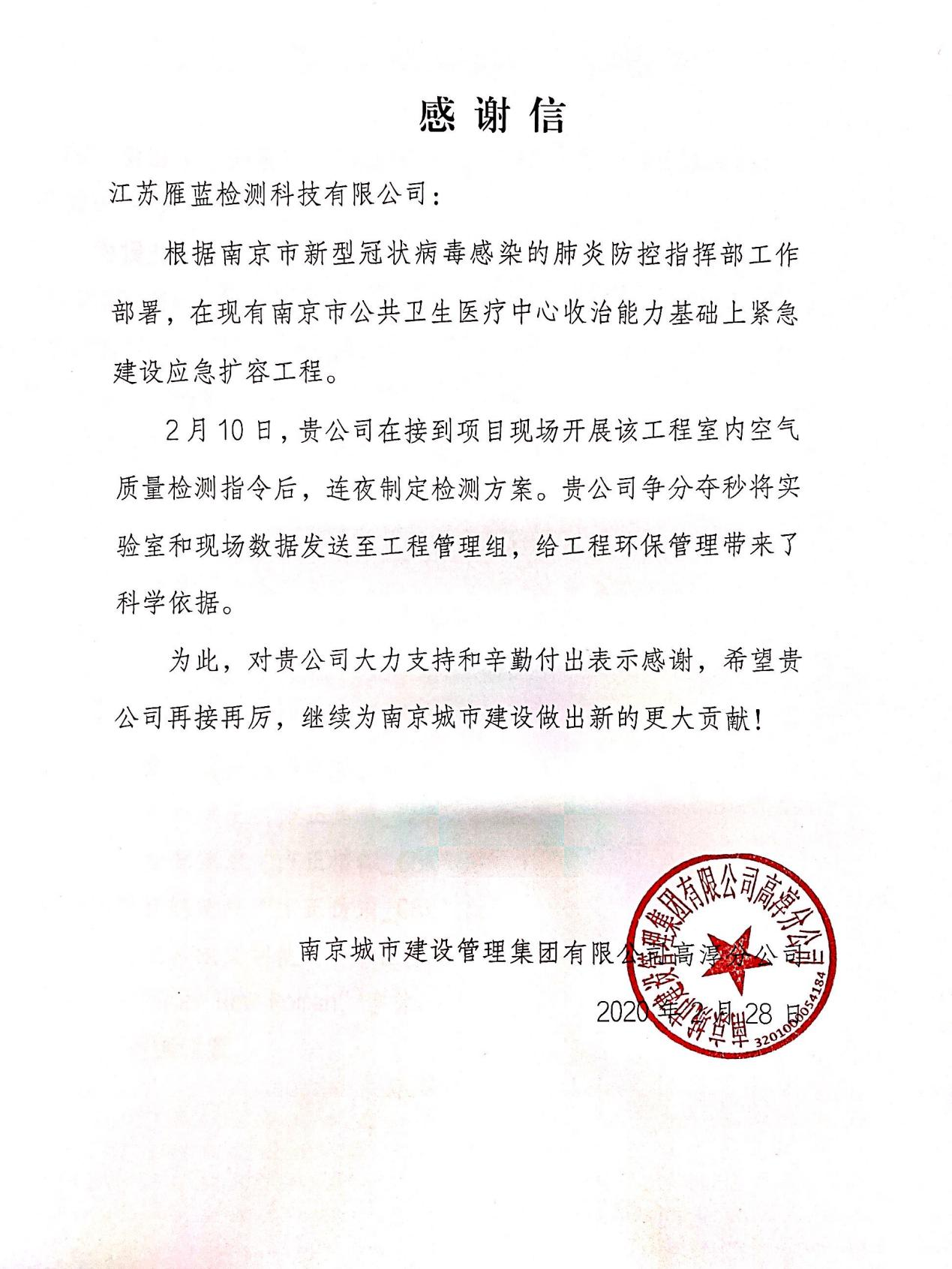面對突發的新冠疫情,根據市疫情防控指揮部部署,在南京新冠肺炎收治點緊急擴建南京版“火神山”,并委派江蘇雁藍馳援該工程的環境檢測工作。接到指令后,我公司6小時內組建完成專項工作組并完成檢測方案上報,技術人員在一線連續奮戰4個晝夜完成全部檢測工作,為指揮部提供全面的檢測數據和分析結果。