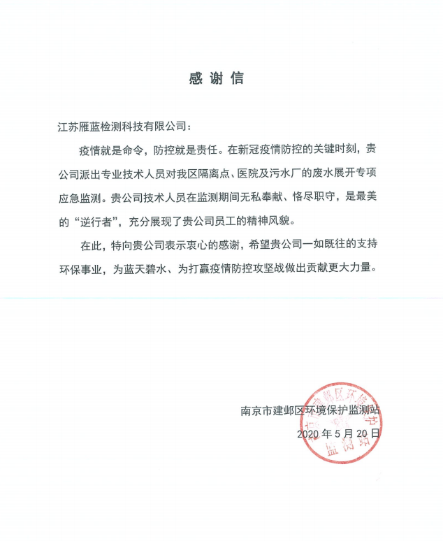 在疫情期間,受建鄴、雨花、江北等環保部門委托,我公司負責對各區隔離點、醫院及污水廠的廢水展開專項應急監測。在克服防護物資緊缺、人員調配困難的情況下深入一線保質保量完成檢測工作,為管理部門提供1000余份檢測數據。